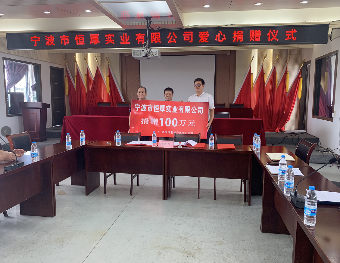 8月3日,恒厚集團(tuán)愛心捐贈(zèng)儀式在洞橋鎮(zhèn)人民政府舉行,恒厚集團(tuán)向海曙區(qū)慈善總會(huì)捐款100萬元,定向用于洞橋鎮(zhèn)“煙花”臺(tái)風(fēng)災(zāi)后重建。