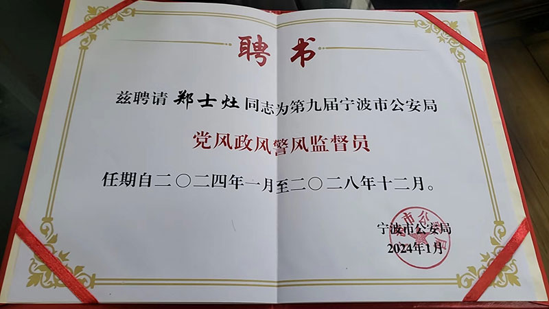 4月19日,市公安局舉行黨風政風警風監(jiān)督員聘任儀式。市公安局相關(guān)領(lǐng)導出席會議。恒厚集團董事長鄭士灶受邀參加會議,并被聘為第九屆寧波市公安局黨風政風警風監(jiān)督員。